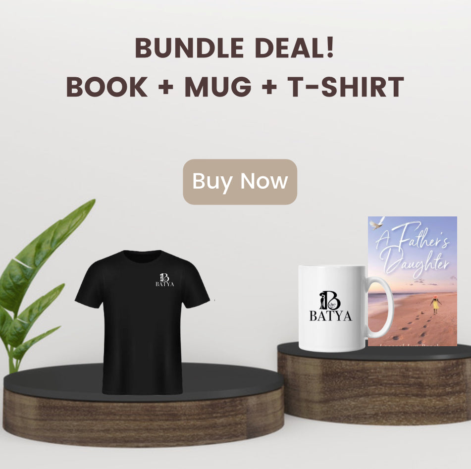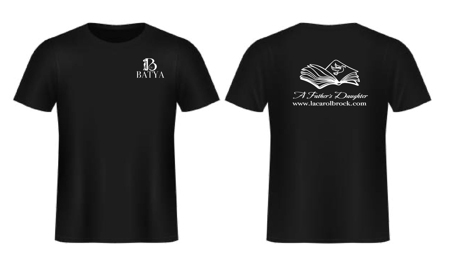 Introducing Batya Tees for men and women - the perfect blend of style and substance. These black cotton t-shirts feature the BATYA logo on the front, and on the back, proudly showcases the title of the published book "A Father's Daughter" along with its website. Show your support for this powerful story while looking effortlessly chic.